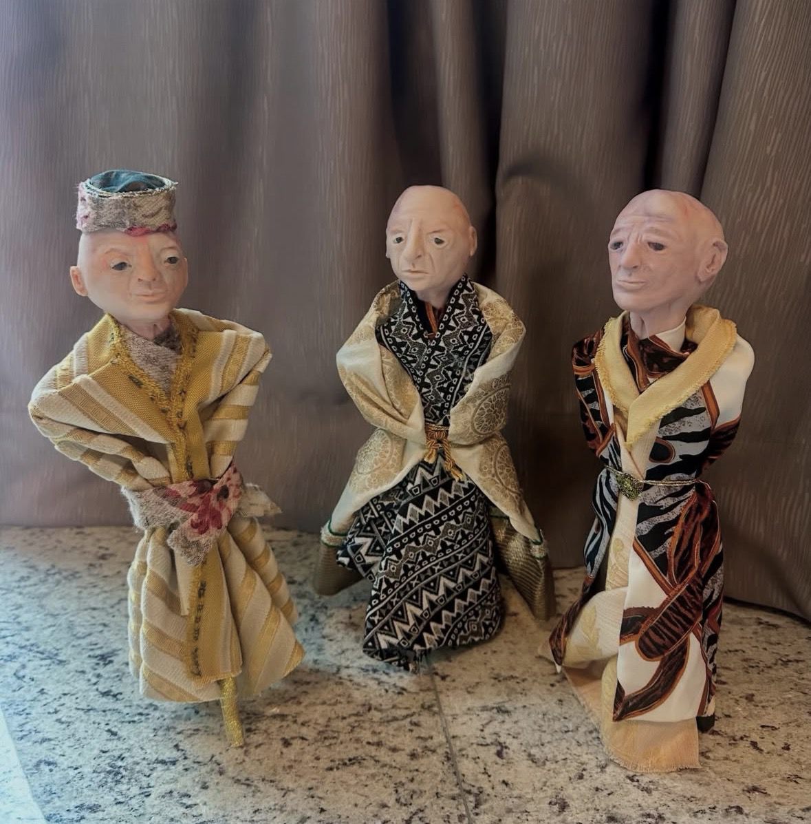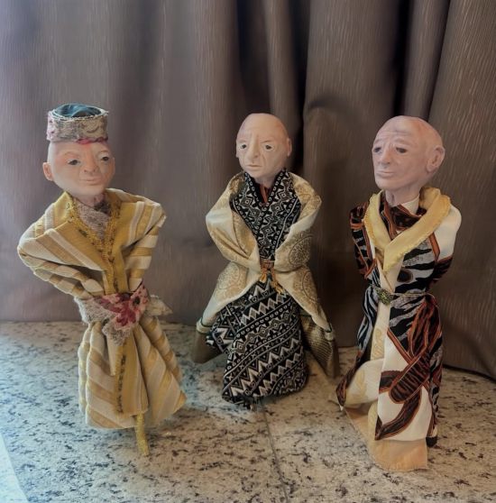 Ruben, Luca and Giovanni from the series of sculptures called: Old men still rule, clay, wood and textiles, 40 x 10 x 10 cm